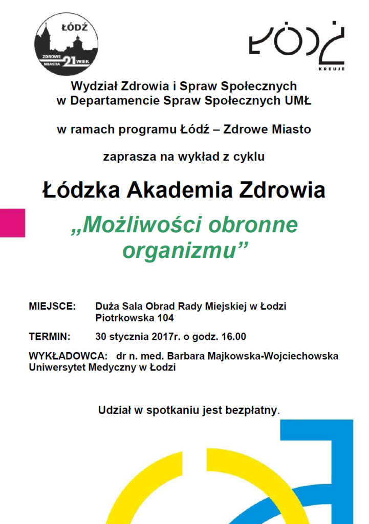 Wydział Zdrowia i Spraw Społecznych w Departamencie Komunikacji Społecznej i Zdrowia w ramach programu Łódź – Zdrowe Miasto zaprasza na wykład z cyklu – Łódzka Akademia Zdrowia. „Możliwości obronne organizmu” MIEJSCE: Duża Sala Obrad Rady Miejskiej w Łodzi, ul. Piotrkowska 104 Udział w spotkaniu jest bezpłatny. ![]() fot. Organizator Źródło: seniorzy.uml.lodz.pl