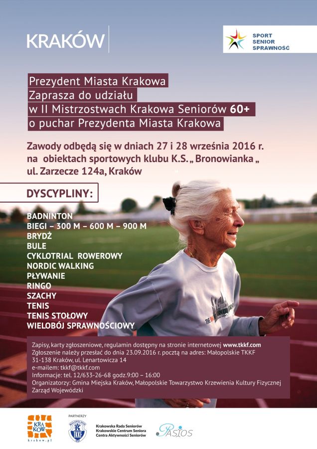 Zgłoś swój udział w II Mistrzostwach Krakowa Seniorów 60+ o Puchar Prezydenta Miasta Krakowa. Zawody odbędą się w dniach 27 i 28 września 2016 r. na obiektach Klubu Sportowego „Bronowianka” przy ul. Zarzecze 124a. Na imprezę zaprasza Gmina Miejska Kraków i Małopolskie Towarzystwo Krzewienia Kultury Fizycznej. Seniorzy będą rywalizować w następujących dyscyplinach: badminton, biegi na dystansie 300, 600 i 900 m, brydż, bule, cyklotrail rowerowy, nordic walking, pływanie, ringo, szachy, tenis, tenis stołowy i wielobój sprawnościowy. Regulamin zawodów oraz karty zgłoszeniowe dostępne są na stronie www.tkkf.com Zgłoszenie należy przesłać do dnia 23 września pocztą na adres: Małopolskie TKKF, ul. Lenartowicza 14, 31-138 Kraków lub e-mailem na skrzynkę: tkkf@tkkf.com. Więcej informacji pod numerem telefonu: 12 633-26-68 w godz. 9-16. Parterami imprezy, organizowanej w ramach Gminnego Programu Aktywności Społecznej i Integracji Osób Starszych PASIOS są: Rada Krakowskich Seniorów, Krakowskie Centrum Seniora, Centra Aktywności Seniorów i Klub Sportowy „Bronowianka”. ![]() Źródło: dlaseniora.krakow.pl Źródło: dlaseniora.krakow.pl |