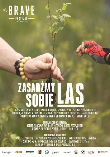 Organizatorzy Brave Festival zapraszają na wspólne sadzenie drzew na wrocławskich Świniarach (niedaleko mostu Pęgowskiego), w dniach 2-3 kwietnia, od godz. 11:00 do 14:00, na 10-hektarowej przestrzeni, odbędzie się wielka akcja ekologiczna pt. „Zasadźmy sobie las!”. Będzie to już 3. edycja tego wyjątkowego wydarzenia. Ideą organizatorów jest wzmocnienie świadomości ekologicznej mieszkańców poprzez wspólne budowanie zielonej infrastruktury miasta. Nowy 10-hektarowy las na Świniarach, ma zapewnić rozwój i doskonalenie jakości życia wszystkich wrocławian. Dwudniową akcję „Zasadźmy sobie las!” zasilą szeregi wolontariuszy z firm Google, UPS, HPE, HP, Drukarnia KEA, Credit Suisse oraz Castorama, a także rodziny goszczące Brave Kids wraz z najmłodszymi ekologami. – Zielony Wrocław to część naszej tożsamości. Drzewa trzeba chronić. Nie czekajmy, aż ktoś zrobi to za nas. Poczujmy się odpowiedzialni za kształtowanie rzeczywistości, która nas otacza – mówi Paulina Anna Galanciak, organizatorka akcji. Dodatkowymi atrakcjami wydarzenia będą warsztaty ekologiczne dla dorosłych i dla dzieci przygotowane przez Fundację Ekorozwoju i Nadleśnictwo „Śnieżka” oraz konkurs na najciekawsze imię dla sadzonki. Zwycięzca otrzyma bilet na wydarzenia odbywające się w ramach Brave Festival 2016. Chcesz mieć swój wkład w ekologię miasta, sprawić, żeby życie w stolicy Dolnego Śląska było odrobinę zdrowsze, a przy okazji spędzić miły weekend w gronie przyjaciół i rodziny? Dołącz do nas! Zaproś swoich przyjaciół, rodzinę i znajomych! Każda para rąk to szybciej powstający las. Masz dodatkowe rękawice i łopatę? Weź je ze sobą! Partnerzy akcji: Druakarnia KEA, Castorama, HP, Hewlett Packard Enterprise, Google, Credit Suisse, UPS, Nadleśnictwo „Śnieżka”, Lasy Państwowe, Fundacja Ekorozwoju, Wrocławskie Centrum Rozwoju Społecznego. ![]() fot. seniorzy.wroclaw.pl