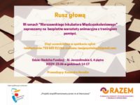 Zapraszamy na Warsztaty Animacyjne “Rusz Głową”, trening pamięci itd. Prowadzący- Kasandra Heredia. KIEDY: 23.06, Piątek, godziny 14-17, GDZIE: ul.Smolna 13, 4 piętro. Źródło: Fundacja Razem |